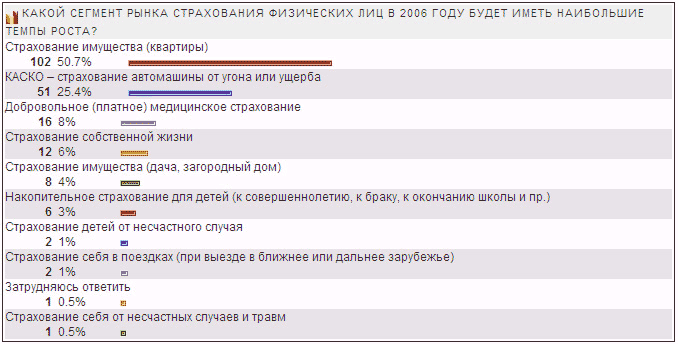 По результатам опроса, проведенного на InsNEWS, 50,7% респондентов дали прогноз, что в 2006 году сегмент страхования имущества будет иметь наибольшие темпы роста. На втором месте оказалось страхование автомашины от угона и ущерба (КАСКО), ему отдали предпочтение 25,4% опрошенных. На ДМС – пришлось 8%, а на страхование собственной жизни – 6%.