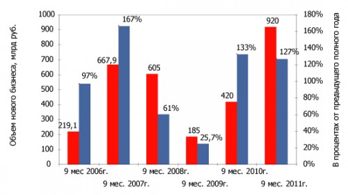 «2011 год станет рекордным по объему в истории развития отечественного лизингового рынка, – считает Станислав Волков, руководитель отдела рейтингов кредитных институтов «Эксперт РА». – По итогам проведенного нами исследования, лизингодатели планируют увеличить объемы новых сделок по итогам года в среднем на 40% по отношению к результату за 9 месяцев 2011 года. Темпы прироста в целом по 2011 году к 2010 году в этом случае составят 76%, а сумма новых сделок – 1,28 трлн рублей. В то же время темпы развития рынка за первые три квартала года соответствовали докризисным тенденциям 2006–2007 годов. Если подобная динамика сохранится, можно ожидать увеличения суммы новых сделок до 1,5 трлн рублей, темпы прироста при этом составят 106%».