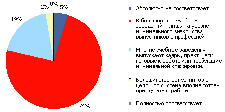 Как показал опрос, 74% респондентов считают, что в большинстве учебных заведений система профессионального образования лишь минимально соответствует потребностям работодателя. Участники опроса констатировали явный недостаток взаимопонимания между работодателями и системой профессионального образования. Именно этим, по мнению участников опроса, объясняется низкое качество подготовки выпускников, которых приходится переучивать или даже практически обучать с нуля.