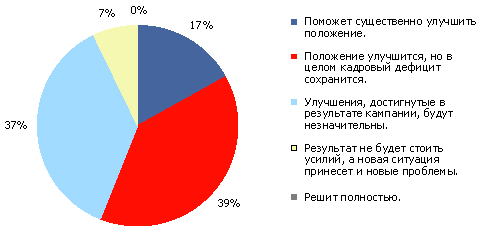 Также опрос показал, что у участников нет единого мнения по поводу оптимальной формы участия предприятий в подготовке кадров. 90% опрошенных полагают, что обучение новых кадров должно проходить с участием предприятий, из них: 27% выступают за создание предприятиями собственных центров по переподготовке выпускников, 20% -- за создание корпоративной кафедры в государственном учебном заведении, по 22% голоса набрали варианты создания предприятиями собственного учебного центра, а также введения образования по договору со стажировкой на предприятии.