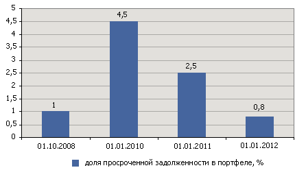 Несмотря на ряд позитивных изменений, многие проблемы в управлении рисками до сих пор не решены. Безусловно, позитивным фактом является снижение просроченной задолженности в лизинговом портфеле – на 01.01.12 по оценке «Эксперт РА» она составила 0,77% портфеля (график 8). Снижение доли произошло как в результате роста суммы самого портфеля, так и благодаря усилиям компаний по урегулированию проблемных сделок. Лизингодатели - участники исследования единодушно утверждают, что остающаяся просрочка сформирована старыми (кризисными) сделками, а по новым контрактам 2010-2011 гг. существенных задержек платежей не наблюдается.