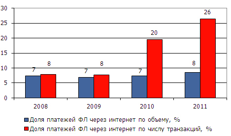 За 2009-2011 гг. доля счетов ФЛ с удаленным управлением выросла с 12% до 25%. В то же время по итогам 2011 года только 8% банковских платежей физических лиц было совершено через интернет, при этом за последние четыре года данный показатель практически не изменился. Медленно растет и доля активных пользователей систем интернет-банкинга: по оценкам «Эксперт РА», она выросла за 2011 год на 1-2 п.п. до 6-7%.