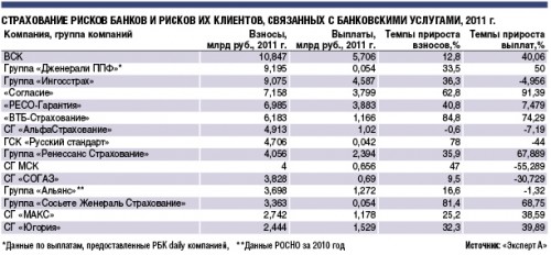 По итогам 2011 года быстрее всего в секторе банкострахования росли страховщики, аффилированные с банками. Из топ-20 страховщиков по объемам взносов через банки по темпам прироста премий вошли «ВТБ Страхование», группа «Сосьете Женераль Страхование» и группа «Русский стандарт». Так, например, прирост «ВТБ Страхования» по итогам прошлого года составил 84,8%, группы «Сосьете Женераль Страхование» — 81,4%, группы страховых компаний «Русский стандарт» — 78% (см. таблицу). По величине чистой прибыли за прошлый год эти компании также входят в число лидеров.