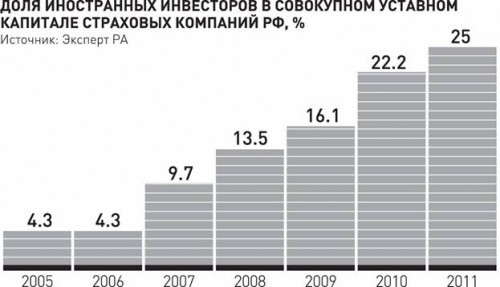По оценкам экспертов, в 2012 году свободный размер участия иностранного капитала в уставных капиталах страховых организаций составит лишь 10,2 млрд рублей, или около 400 млн долларов, что сопоставимо с покупкой иностранными инвесторами 1-2 российских страховщиков из Топ-40. В случае принятия законопроекта об увеличении квоты до 50% и увеличения капитала всеми российскими страховщиками до требуемой величины, по оценкам экспертов, свободный размер участия иностранного капитала составит 60,8 млрд рублей, или около 2 млрд долларов.