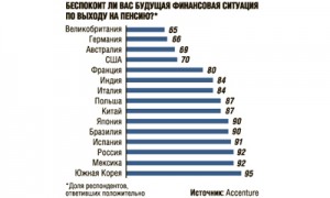 В России также больше всего переживают, как прожить в старости. На вопрос «Испытываете ли вы беспокойство по поводу своего финансового положения по выходе на пенсию?» 92% опрошенных ответили утвердительно. Больше россиян о своей будущей пенсии переживают только мексиканцы и жители Южной Кореи. Население в странах с развитой экономикой беспокоится о том, как прожить на пенсии, гораздо меньше.