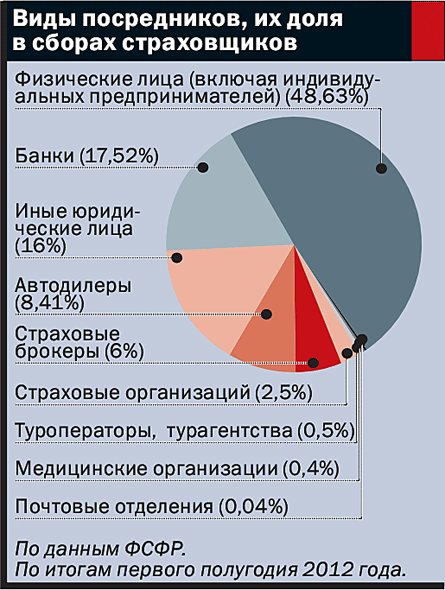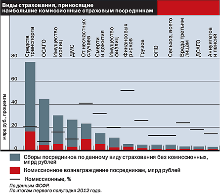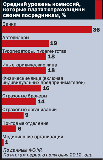 По данным ФСФР, в январе—июне этого года посредники помогли страховщикам заключить договоры страхования, совокупная премия по которым (без ОМС) составила 255,7 млрд руб., то есть больше половины совокупных сборов (412,4 млрд руб.). За возможность получить эти деньги страховщикам приходится отдавать порой свыше трети страховой премии (а по неофициальным данным — гораздо больше). Лидерами по объему получаемой комиссии являются банки, для которых этот показатель в среднем составляет 35,7%.