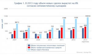 Аналитики рейтингового агентства «Эксперт РА» прогнозируют два возможных сценария развития рынка лизинга в 2013 году. Оптимистичный сценарий предполагает слабый рост железнодорожного сегмента и стабильный рост остальных крупнейших сегментов рынка (сумма новых сделок составит 1,42 трлн руб.). Прирост новых сделок на уровне 8% в данном случае будет сопоставим с инфляцией. Пессимистичный сценарий базируется на дальнейшем сокращении сделок с подвижным составом (в пределах 15%) в сочетании со слабым ростом остальных сегментов рынка. В этом случае рынок ожидает стагнация: темпы прироста рынка составят около 0%, а сумма новых сделок – останется на уровне 1,32 трлн руб.