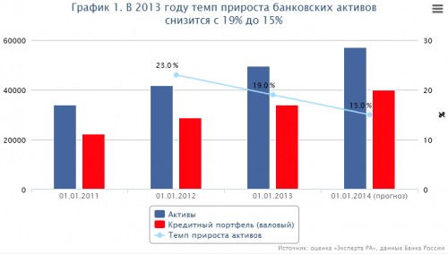 Аналитики рейтингового агентства «Эксперт РА» прогнозируют, что по итогам 2013 года темп прироста активов и валового кредитного портфеля банков составит порядка 15 и 17% соответственно. Прогноз исходит из предпосылки к замедлению динамики реального ВВП до 2-2,5% (с 3,4% в 2012 году). В наибольшей степени в 2013 году замедлится розничное кредитование: темпы его прироста снизятся с 40 до 30% за счет «мягкой посадки» сегмента необеспеченных кредитов (с 55-60% до 40-45%). Динамика кредитования крупного бизнеса не превысит 10% (против 12% в 2012-м): в настоящее время наблюдается избыток ликвидности у крупного бизнеса, и с января по апрель кредитный портфель таких клиентов практически не показал роста. Единственный сегмент, который может избежать заметного замедления в 2013 году, – кредитование МСБ (15-16%) – во многом за счет «тиражирования» банками микрокредитов бизнесу.