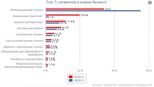 Сжатие ж/д-сегмента в 2 раза привело к сокращению рынка лизинга в 1-ом полугодии 2013 года на 17%, говорится в исследовании «Рынок лизинга по итогам 1 полугодия 2013 года: все на «фабрику», подготовленном рейтинговым агентством «Эксперт РА». От большего падения рынок спас авиализинг, увеличившийся за этот период в 7 раз, а без его учета падение рынка составило бы около 32%. В результате авиализинг стал вторым сегментом по объему нового бизнеса. Сокращение рынка без учета сделок ж/д и авиализинга составило 11%.