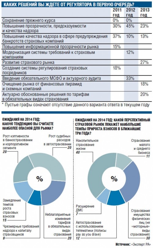 «В прошлом году лидеры страхового рынка в первую очередь ожидали повышения прозрачности и предсказуемости надзора, в позапрошлом году — повышения качества надзора в сфере раннего предупреждения банкротств страховых компаний (36%). В 2013 году после введения МСФО и принятия закона об актуариях эти темы стали менее актуальны,— прокомментировала результаты опроса замруководителя отдела рейтингов страховых компаний «Эксперт РА» Наталья Комлева. — Более того, некоторые страховщики, наоборот, опасаются ужесточения надзора (в частности, увеличения требований к минимальному уставному капиталу) — этот вариант как наибольшую опасность для рынка выбрали 9% опрошенных».