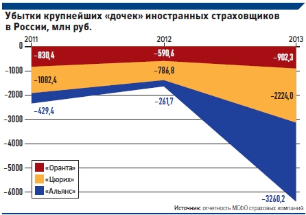 «Цюрих» — не единственная иностранная страховая компания с высокой убыточностью. СК «Альянс» показала за 2013 год по МСФО убыток в 3,26 млрд руб., при этом на собственно страховой деятельности потеряла еще больше — 5,05 млрд руб. Это один из худших результатов на рынке. «Российский рынок страхования сложный. Иностранные инвесторы зачастую не учитывают нашу специфику. Не отслеживают в полной мере мошенничество, иногда не понимают, где нужно сократить комиссию, для того чтобы сократить портфель, а где, напротив, лучше переплатить, но получить качественного клиента», — говорит представитель страховщика из топ-10.